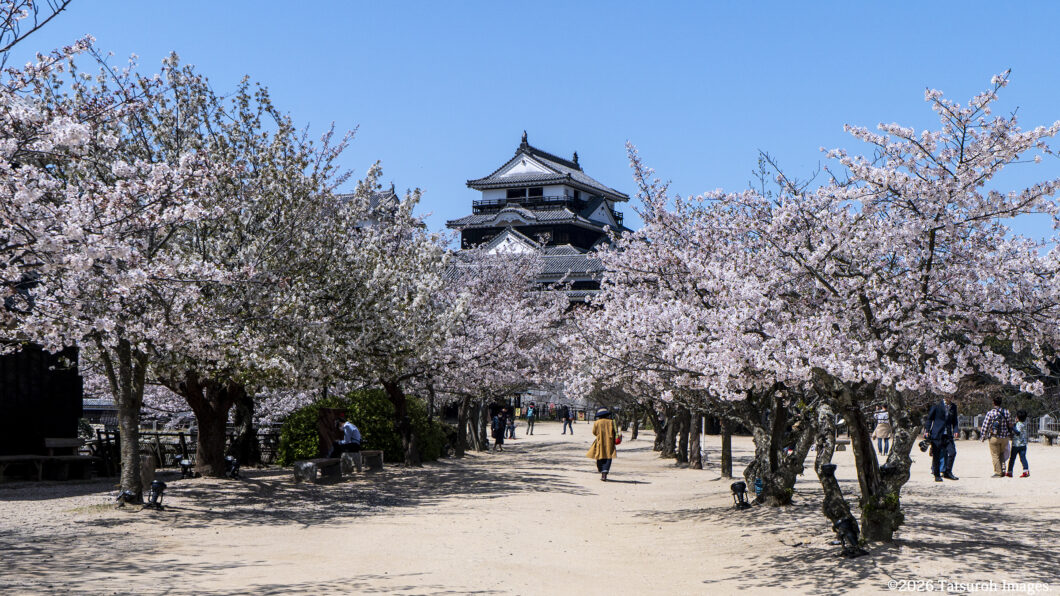 県都松山にあって現存12城のひとつに数えられる松山城。今年の桜の開花は去年と同様に4月に入ってからが満開。私が取材撮影した3月22日には、まだ全然咲いていなかったので過去の写真でご容赦いただきたい。