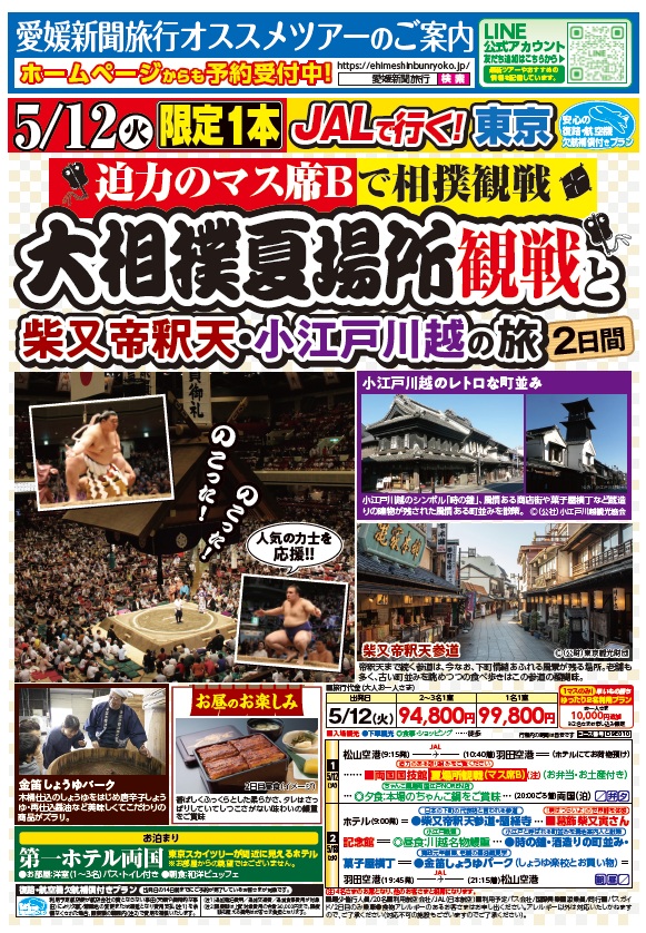 | 1日目 | 松山空港( 9:15)⇒⇒⇒羽田空港(10:40)===ホテルにてお荷物預け・・・■両国国技館(大相撲夏場所を迫力のマスB席よりご観戦)※お弁当・お土産付・・・ちゃんこ霧島江戸NOREN店(ちゃんこ料理の夕食)・・・ホテル(20:00頃)(泊)