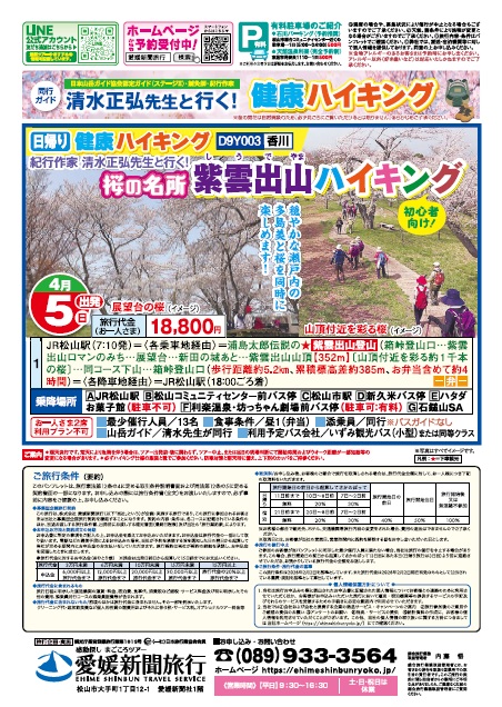 | 1日目 | JR松山駅(7:10発)===<各乗車地経由>=== 浦島太郎伝説の★紫雲出山登山(箱峠登山口・・・紫雲出山ロマンのみち・・・展望台・・・新田の城あと・・・紫雲出山山頂【352ⅿ】(山頂付近に彩る約1千本の桜)・・・同コース下山・・・箱峠登山口/歩行距離約5.2㎞、累積標高差上り約385ⅿ、お弁当含めて約4時間)===<各降車地経由>===JR松山駅(18:00頃)