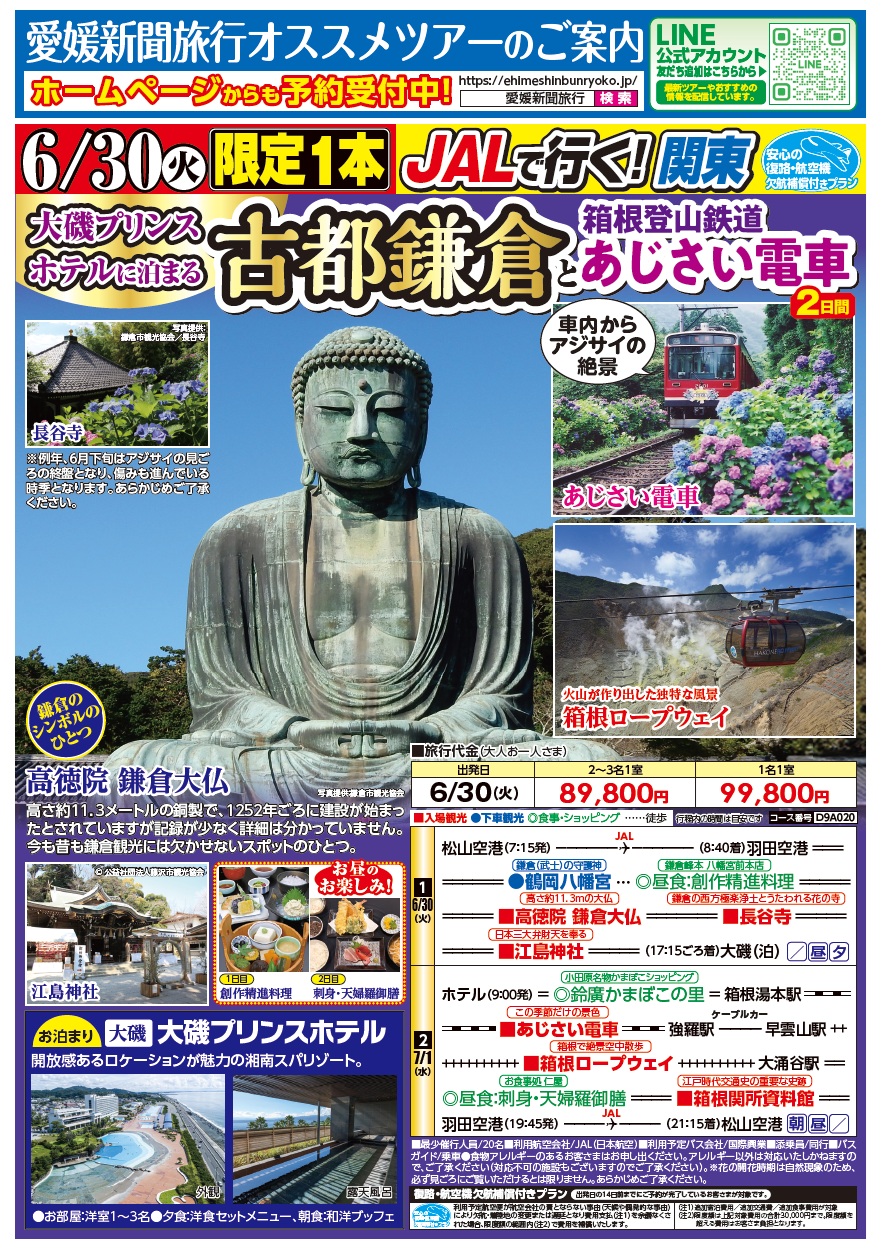 | 1日目 | 松山空港(7:15発)⇒⇒⇒( 8:40着)羽田空港===●鶴岡八幡宮(武家社会の守護神)===◎鎌倉峰本 八幡宮前本店(創作料理のご昼食)===■高徳院 鎌倉大仏(鎌倉のシンボルと言われる高さ11.3mの大仏)===■長谷寺(鎌倉の西方極楽浄土と謳われる花の寺)===●江島神社(日本三大弁財天を奉る神社)===大磯プリンスホテル(泊)(17:15ごろ着)