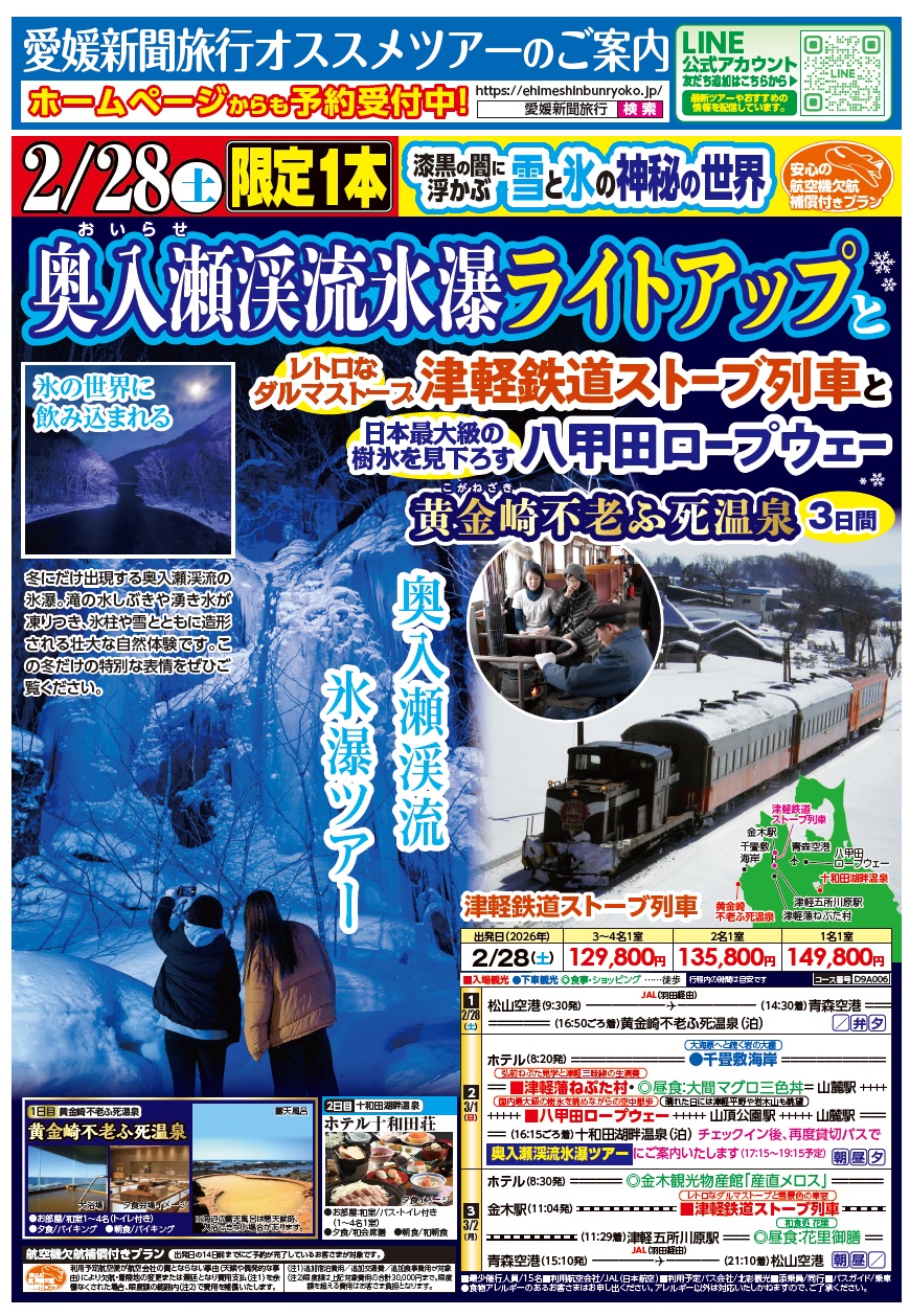 奥入瀬渓流氷瀑ライトアップと津軽ストーブ列車と八甲田ロープウェー 黄金崎不老ふ死温泉 3日間