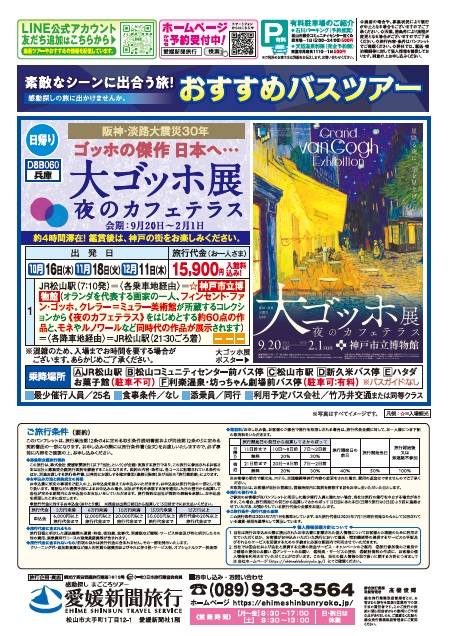 1日目 | JR松山駅(7:10発)===<各乗車地経由>===■神戸市立博物館(オランダを代表する画家の一人、フィンセント・ファン・ゴッホ。クレラー・ミュラー美術館が所蔵するコレクションから《夜のカフェテラス》をはじめとする約60点の作品と、モネやルノワールなど同時代の作品が展示されます)===<各降車地経由>===JR松山駅(21:30ごろ着)