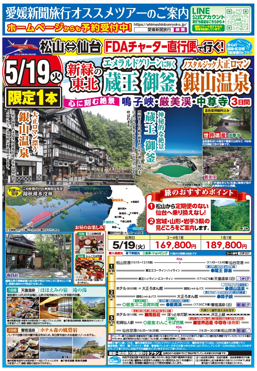 FDAチャーター便で行く!新緑の東北 エメラルドグリーンに輝く蔵王御釜 ノスタルジック大正ロマン銀山温泉・鳴子峡・厳美渓・中尊寺 3日間