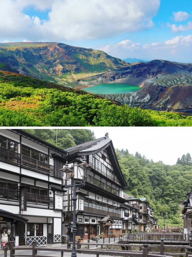 上段:蔵王 御釜、下段:銀山温泉街 イメージ