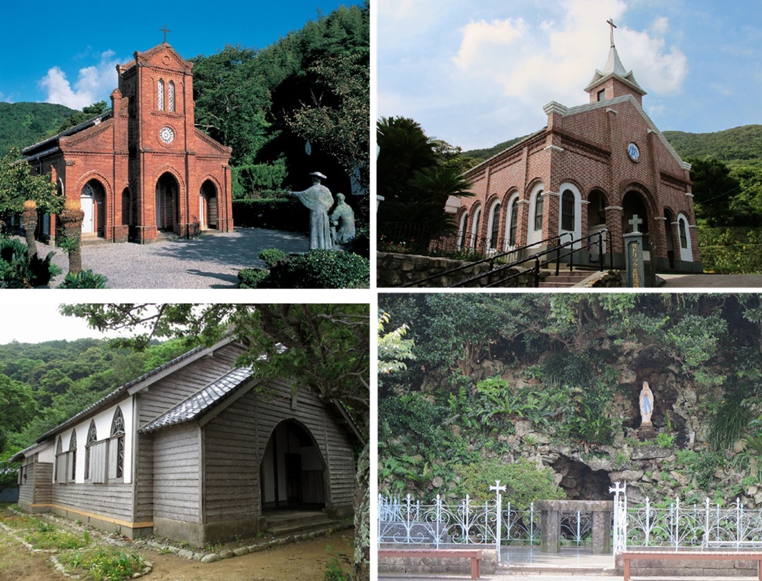 左上:堂崎教会©長崎県観光連盟 左下:旧五輪教会堂©長崎県観光連盟 右上下:井持浦教会ルルド©長崎県観光連盟 ※写真掲載に当たっては大司教区の許可をいただいています。