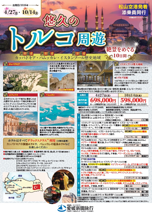 | 宿泊 | 【イズミール】カヤ イズミル サーマル & コンベンション ホテル 【パムッカレ】スパ ホテル サーマル コロッセア 【カパドキア】カルセドン ケーブ スイーツ 【イスタンブール】ハイアット リージェンシー イスタンブール アタキョイ【羽田空港】羽田エクエルホテル東急 | ||