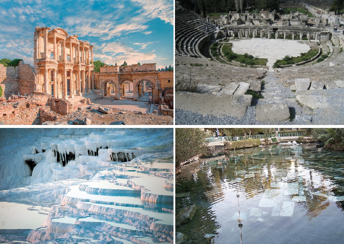 左上:エフェソス遺跡 ケルスス図書館 右上:円形大劇場 左下:パムッカレの石灰棚 右下:パムッカレの遺跡プール イメージ