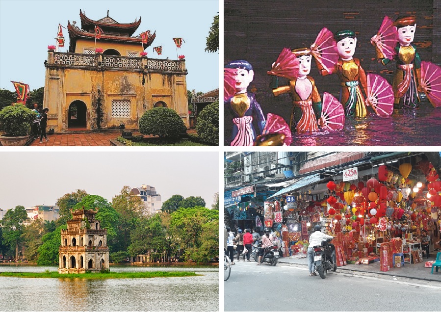 上段左:タンロン城址 上段右:水上人形劇 下段左:ホアンキエム湖 下段右:ハノイ旧市街 イメージ