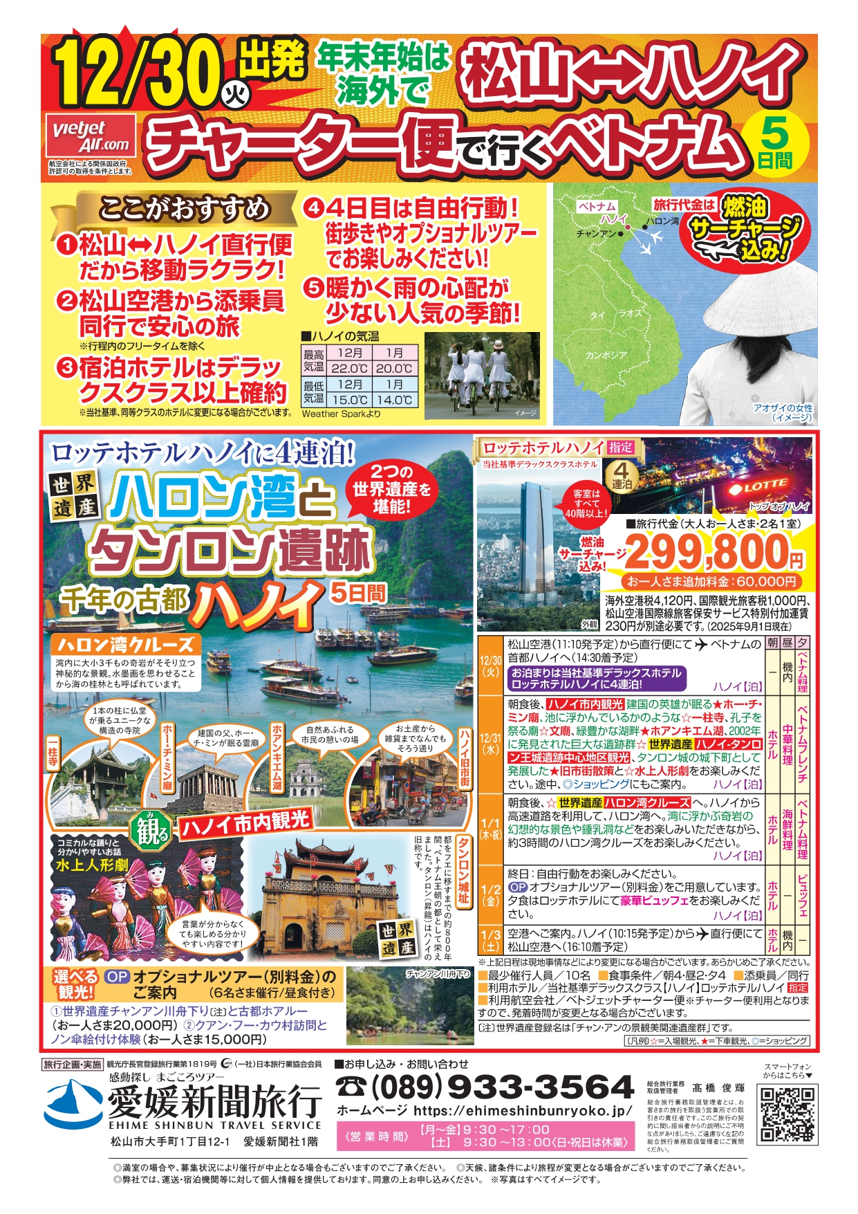 その他 | ※燃油サーチャージは旅行代金に含まれています。 ※別途費用:海外空港税4,120円、 国際観光旅客税1,000円、 松山空港国際線旅客保安サービス特別付加運賃230円(2025年9月1日現在) ※記載のチャーター便の出発・到着時刻は予定です。大幅な変更となる場合があります。発着時刻の確定は出発の20日前頃を予定しております。 ※現地の諸事情や交通機関のスケジュール等により行程が変更となる場合があります。 ※往路便・復路便ともに機内食は「軽食」です。 ※ハロン湾クルーズ/天候により、ハロン湾クルーズ船の出航が中止となった場合は、ホンガイ地区観光へご案内します。返金はありませんのでご了承ください。 ※催行決定後も、国・愛媛県・ベトナム政府による行動制限や渡航自粛要請が発令された場合、やむなく中止とする場合がありますので、あらかじめご了承ください。 |