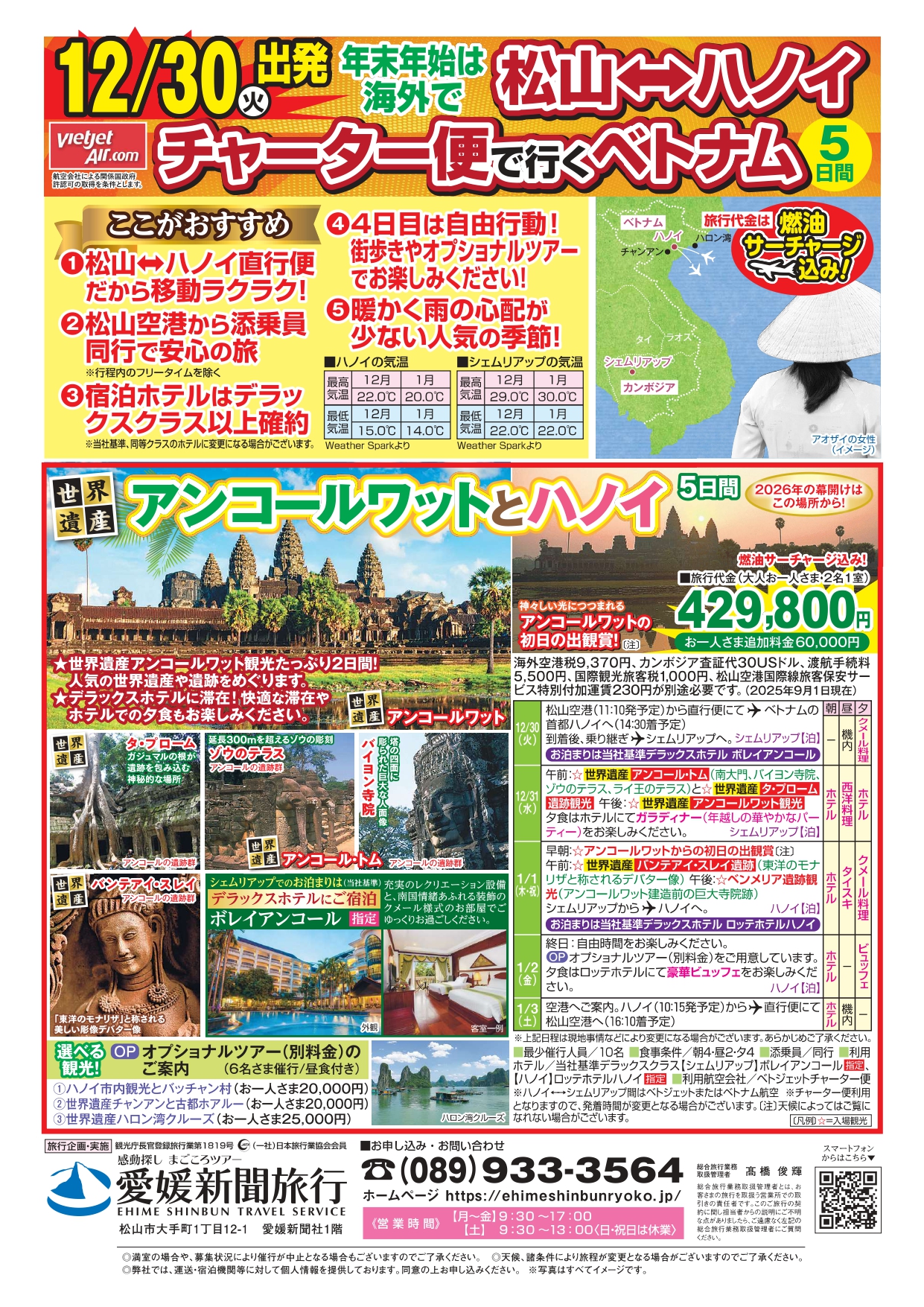 その他 | ※燃油サーチャージは旅行代金に含まれています。 ※海外空港税9,370円、カンボジア査証代30USドル、渡航手続き料5,500円、国際観光旅客税1,000円、松山空港国際線旅買う保安サービス特別付加運賃230円が別途必要です。(2025年9月1日現在) ※記載のチャーター便の出発・到着時刻は予定です。大幅な変更となる場合があります。発着時刻の確定は出発の20日前頃を予定しております。 ※現地の諸事情や交通機関のスケジュール等により行程が変更となる場合があります。 ※往路便・復路便ともに機内食は「軽食」です。 ※催行決定後も、国・愛媛県・ベトナム政府による行動制限や渡航自粛要請が発令された場合、やむなく中止とする場合がありますので、あらかじめご了承ください。 |