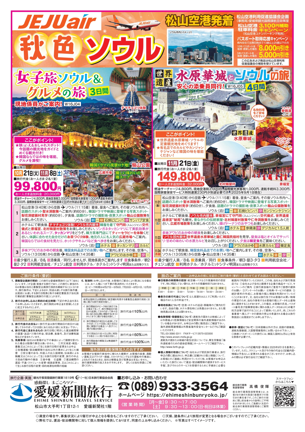 その他 | 【旅券・査証について】 ・旅券(パスポート):この旅行には入国時有効期間が3か月以上あるパスポートが必要です。 ・査証(ビザ):必要ありません。 ※以上は日本国籍のお客様の場合の条件です。 ※旅行条件は2025年9月1日を基準としています。また、旅行代金は2025年9月1日現在有効な運賃・適用規則を基準として算出しています。 ※利用航空便の発着時刻は2025年2月1日現在のものです。航空会社の都合により予告なしに変更となる場合がございます。 ※航空機の利用クラス/エコノミークラス(全席禁煙) ※チェジュ航空はLCCとなります。(受託荷物おひとり様15kg1個まで、機内食サービスなし) ※旅行代金には韓国空港税、燃油サーチャージは含まれておりませんので別途必要になります。 ■下記、項目は旅行代金に含まれておりません。ご旅行代金ご請求時に合わせてご請求させていただきます。(2025年2月1日現在) ◆海外空港諸税 目安:3,000円(大人・子供同額) ◆燃油サーチャージ 目安:4,800円(大人・子供同額) ◆国際観光旅客税(大人・子供同額) 1,000円 ◆国際旅客保安サービス特別運賃 230円 ◆渡航手続き費用 3,300円 ★パスポート取得応援キャンペーン対象商品です。愛媛県在住でパスポートを新規に取得または更新される方で出発日地点で13歳~25歳以下の方はいただける方は旅行代金から5,000円引き(5年パスポートの方)または8,000円引き(10年パスポートの方)となります。 ★松山空港駐車料金3,100円補助キャンペーン対象商品です。(松山空港コナンパーキング利用) |