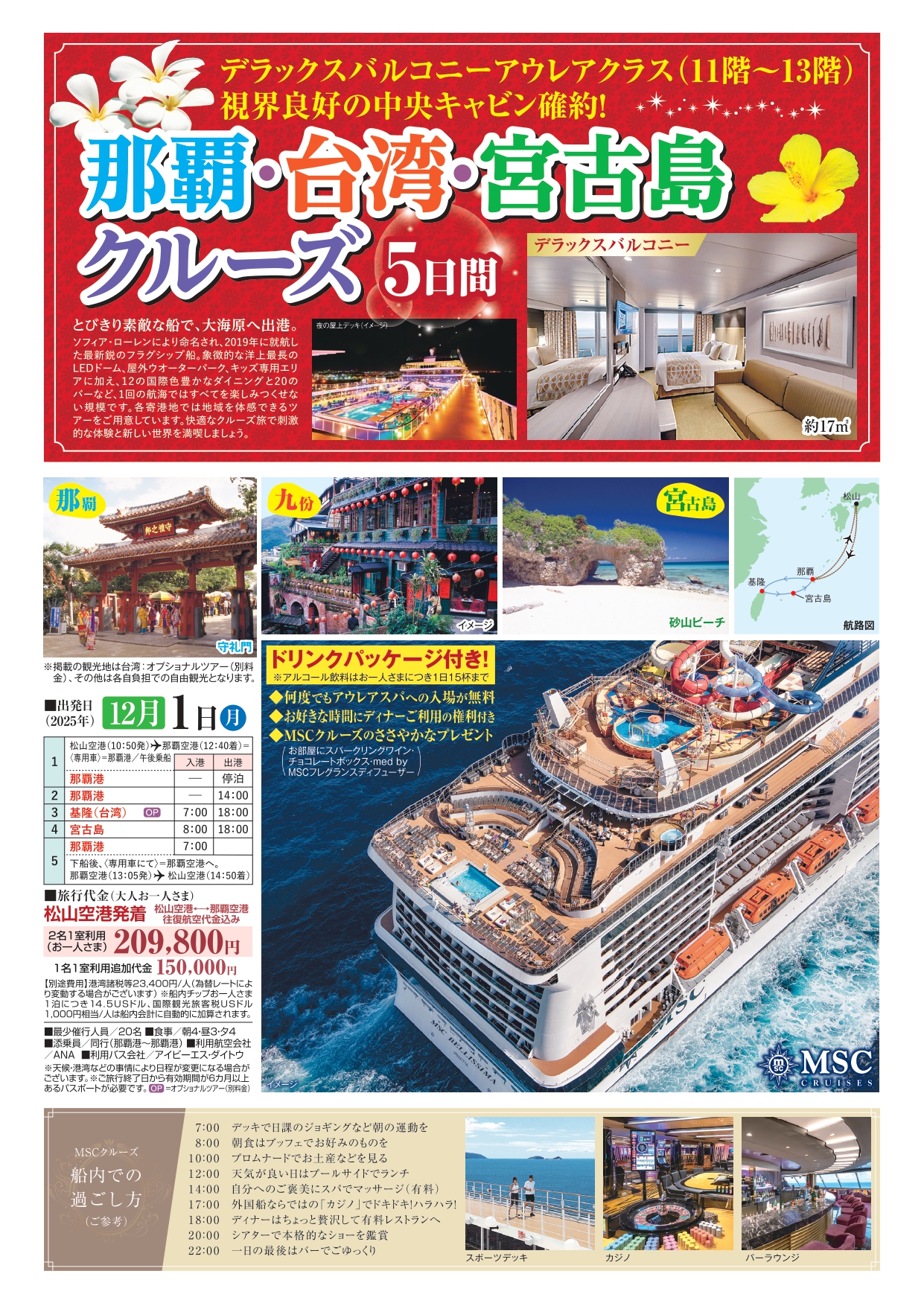 松山空港発着 上級バルコニーデッキ11階~13階,中央キャビン確約‼MSCベリッシマで航く!那覇・台湾・宮古島クルーズ5日間