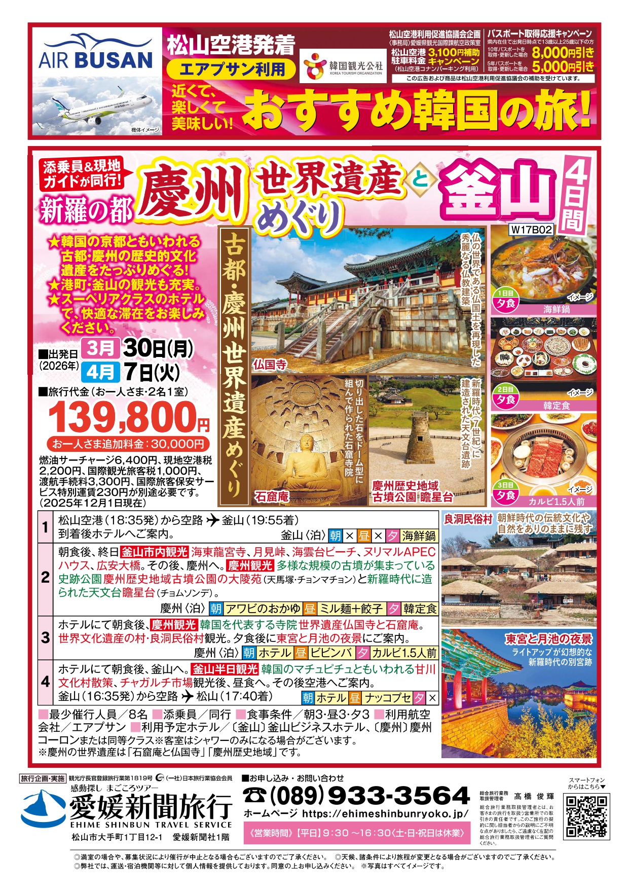 | その他 | 【旅券・査証について】 ・旅券(パスポート):この旅行には入国時有効期間が3か月以上あるパスポートが必要です。 ・査証(ビザ):必要ありません。 ※以上は日本国籍のお客様の場合の条件です。 ※旅行条件は2025年12月1日を基準としています。また、旅行代金は2025年12月1日現在有効な運賃・適用規則を基準として算出しています。 ※利用航空便の発着時刻は2025年12月1日現在のものです。航空会社の都合により予告なしに変更となる場合がございます。 ※航空機の利用クラス/エコノミークラス(全席禁煙) ※エアプサンはLCCとなります。(受託荷物おひとり様15kg/個数制限なし、機内持ち込み手荷物10㎏まで無料、機内食サービスなし) ※旅行代金には韓国空港税、燃油サーチャージは含まれておりませんので別途必要になります。 ■下記、項目は旅行代金に含まれておりません。ご旅行代金ご請求時に合わせてご請求させていただきます。(2025年12月1日現在) ◆海外空港諸税 目安:2,200円(大人・子供同額) ◆燃油サーチャージ 目安:6,400円(大人・子供同額) ◆国際観光旅客税(大人・子供同額) 1,000円 ◆松山空港国際線旅客保安サービス特別付加運賃(大人・子供同額)230円 ◆渡航手続き費用 3,300円 ★松山空港駐車料金3,100円補助キャンペーン対象商品です。(松山空港コナンパーキング利用) ★愛媛県パスポート取得応援キャンペーン対象商品です。(県内在住かつ出発日時点で13歳以上25歳以下の方対象)詳細はお問い合わせください。 |